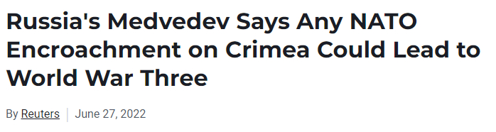 据路透社27日报道,俄罗斯前总统、如今担任俄罗斯联邦安全会议副主席的梅德韦杰夫警告,任何侵犯克里米亚的企图都会被认定为对俄宣战,如果北约国家这样做,可能导致“第三次世界大战”。