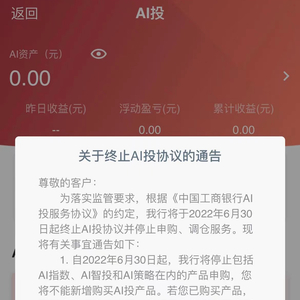 上述通告称,自2022年6月30日起,该行将停止包括AI指数、AI智投和AI策略在内的产品申购,客户将不能新增购买AI投产品。