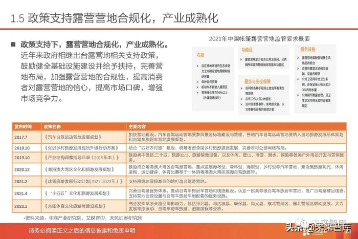政策支持下,露营营地合规化,产业成熟化。近年来政府相继出台露营地相关支持政策, 鼓励健全基础设施建设并给予扶持,完善营 地布局,加强露营营地的合规性,提高消费 者对露营营地的信心,提高市场口碑,增强 市场竞争力。