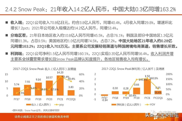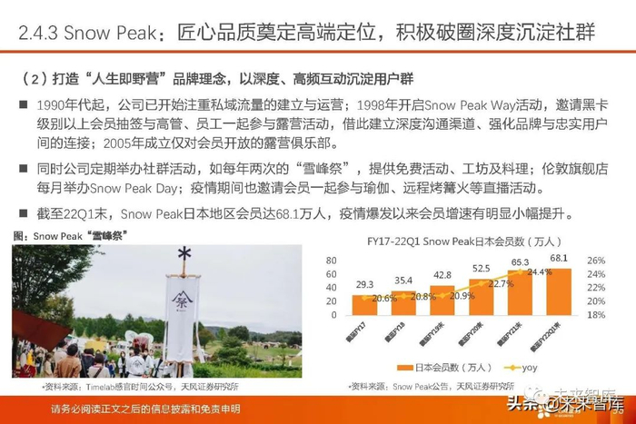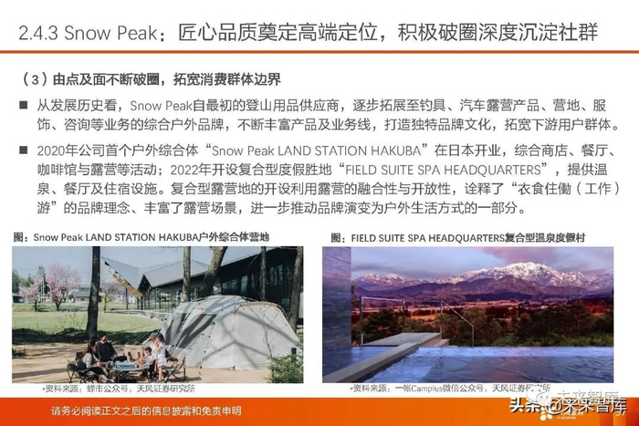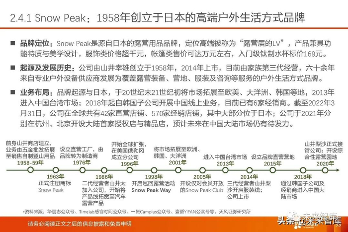 品牌定位:Snow Peak是源自日本的露营用品品牌,定位高端被称为“露营届的LV”,产品兼具功 能特质与美学设计,服饰类价格超千元,帐篷类售价可达万元左右,入门级钛制水杯标价169元。起源及发展历史:公司由山井幸雄创立于1958年,2014年上市,目前由家族第三代经营,六十余年 来自专业户外设备供应商发展为覆盖露营装备、营地、服装及咨询等服务的户外生活方式品牌。