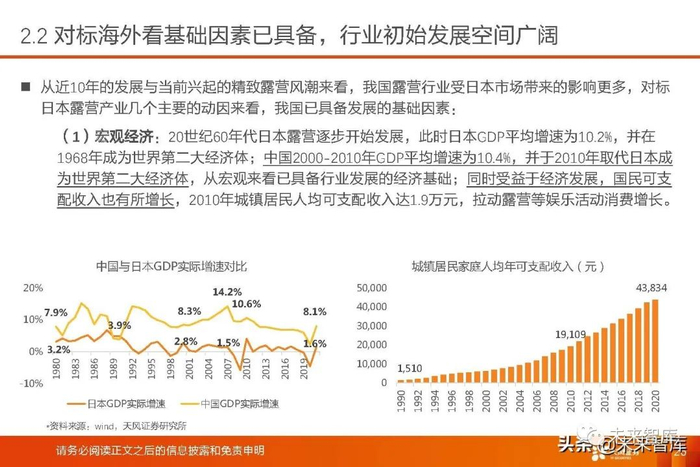 从近10年的发展与当前兴起的精致露营风潮来看,我国露营行业受日本市场带来的影响更多,对标 日本露营产业几个主要的动因来看,我国已具备发展的基础因素:宏观经济:20世纪60年代日本露营逐步开始发展,此时日本GDP平均增速为10.2%,并在 1968年成为世界第二大经济体;中国2000-2010年GDP平均增速为10.4%,并于2010年取代日本成 为世界第二大经济体,从宏观来看已具备行业发展的经济基础;同时受益于经济发展,国民可支 配收入也有所增长,2010年城镇居民人均可支配收入达1.9万元,拉动露营等娱乐活动消费增长。