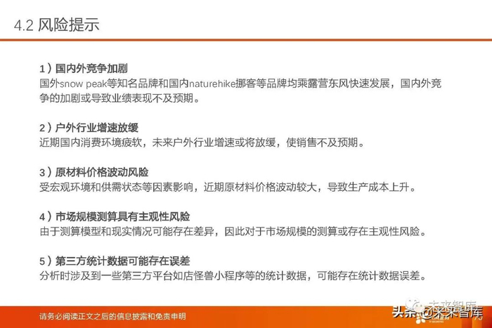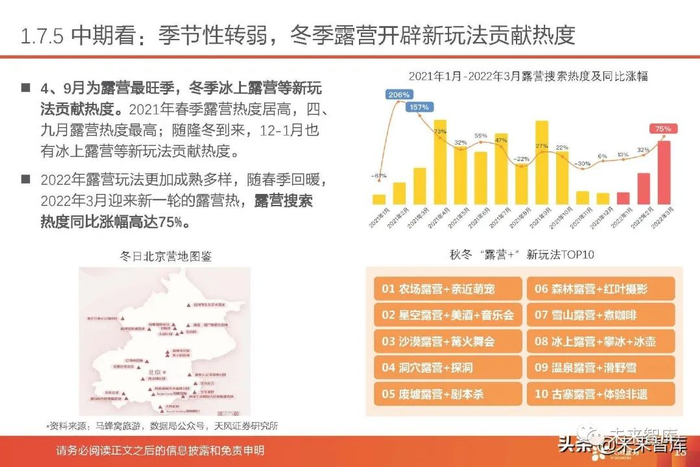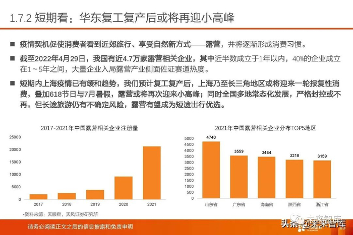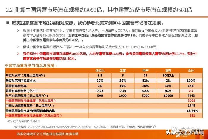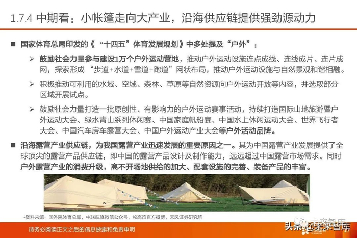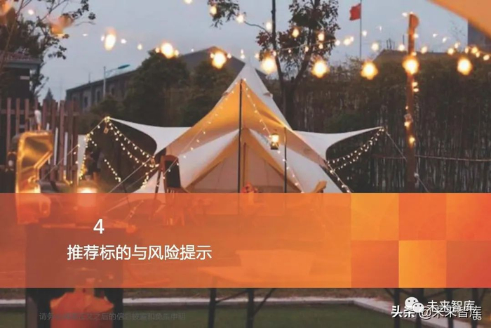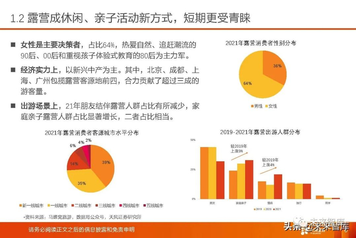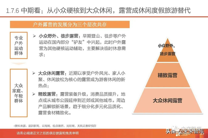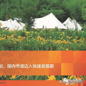 精致露营1)上游主要由户外用品供应商组成;2)中游为提供露营服务的露营基地;3)下游主 要为一线及新一线城市的新中产与年轻群体,并逐渐向二三四线城市延伸。