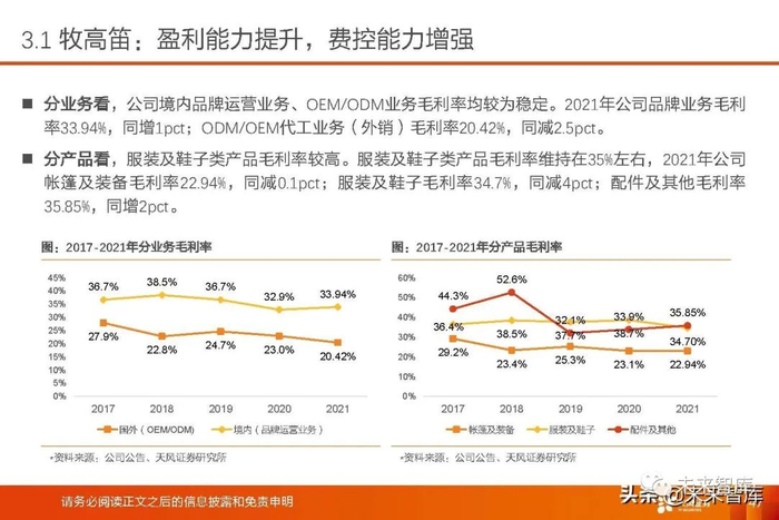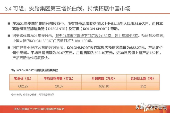 在2021年安踏的集团分部收益中,所有其他品牌收益同比上升51.1%到人民币34.9亿元,由日本 高端滑雪品牌迪桑特(DESCENTE)及可隆(KOLON SPORT)帶动。据安踏体育2021年报显示,截至21年末可隆线下门店数为152家,较上年减少5家。预计到22年末, 中国大陆的KOLON SPORT门店数目将为180-190间。