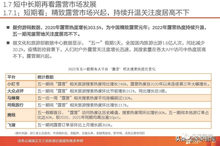 据穷游网数据,2020年露营热度增长303.5%,为中国精致露营元年;2022年露营热度持续升温, 五一期间露营地关注度居高不下。据文化和旅游部数据中心数据显示,“五一”假期5天,全国国内旅游出游1.6亿人次,同比减少 30.2%,疫情防控背景下,人们对户外露营关注度增长迅速,其搜索量在各大APP访问中热度居高 不下,露营潮兴起。