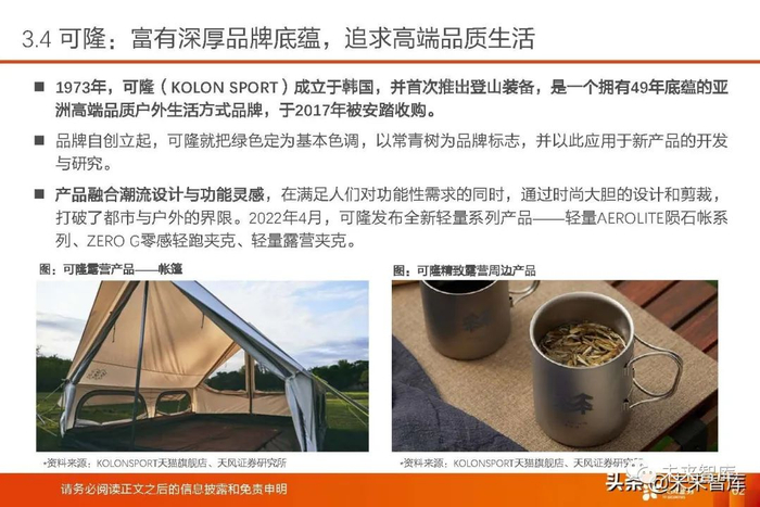 产品融合潮流设计与功能灵感,在满足人们对功能性需求的同时,通过时尚大胆的设计和剪裁, 打破了都市与户外的界限。2022年4月,可隆发布全新轻量系列产品——轻量AEROLITE陨石帐系 列、ZERO G零感轻跑夹克、轻量露营夹克。