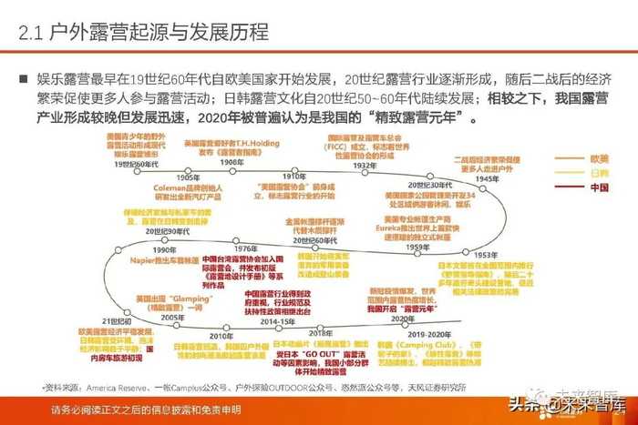 娱乐露营最早在19世纪60年代自欧美国家开始发展,20世纪露营行业逐渐形成,随后二战后的经济 繁荣促使更多人参与露营活动;日韩露营文化自20世纪50~60年代陆续发展;相较之下,我国露营 产业形成较晚但发展迅速,2020年被普遍认为是我国的“精致露营元年”。