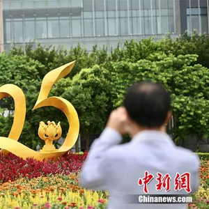 2022年6月22日,香港市民在金钟添马公园拍摄“花悦满城”庆回归花艺摆设。中新社记者 李志华 摄