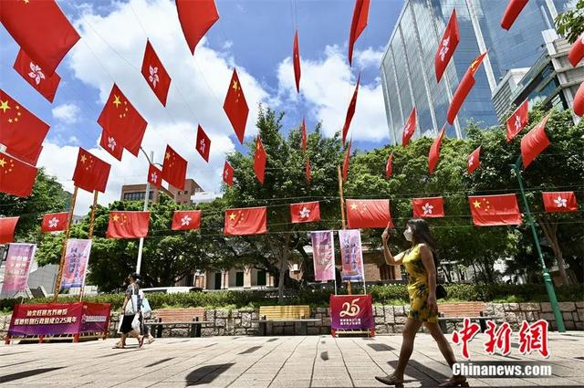 2022年6月27日,随着香港回归祖国25周年纪念日临近,香港尖沙咀的庆回归气氛浓厚。图为市民拍摄尖沙咀栢丽购物大道上的国旗及区旗。中新社记者 李志华 摄