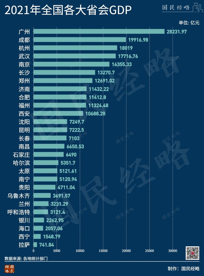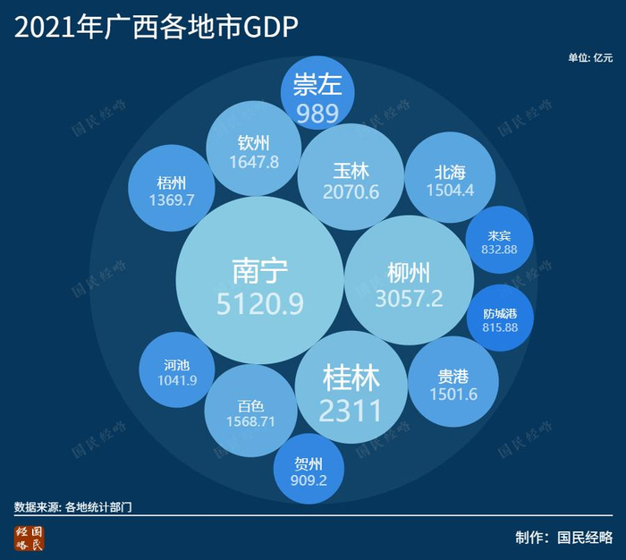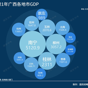 从领头羊城市来看,广西首府南宁2021年GDP为5120亿元,止步于50强之外,仅相当于广东惠州市的水平,不到广州的1/5。