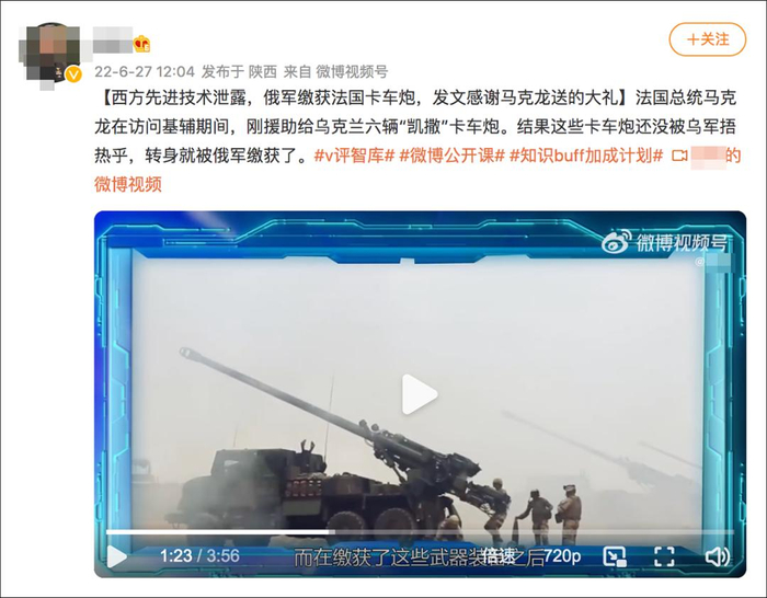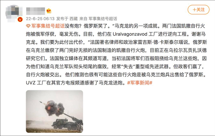 中文网络流传消息称:“法国总统马克龙在访问基辅期间,刚援助给乌克兰六辆凯撒卡车炮。结果这些卡车炮还没被乌军捂热乎,转身就被俄军缴获了。”
