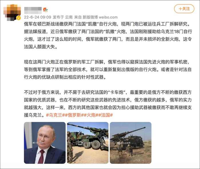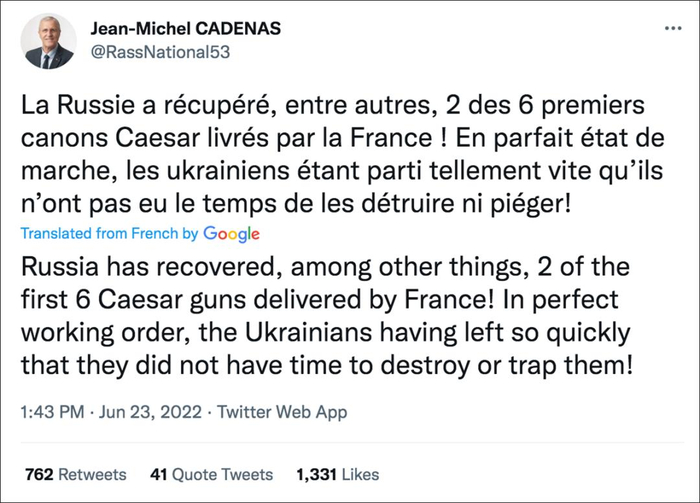 6月23日,法国极右翼政党国民联盟(RN) 马耶纳省的代表让-米歇尔·卡德纳斯(Jean-Michel CADENAS)再次发布类似的信息:“俄罗斯缴获了法国交付的首批6门凯撒炮中的2门!它们处于完美的工作状态。乌克兰人撤离得如此之快以至于甚至都没有时间去破坏它们!被俄罗斯军队夺走的两门凯撒已被运往俄罗斯的一个军事制造厂——乌拉尔机车车辆厂。它们将被剖析、研究、复制和改进,俄罗斯可能会生产出凯撒的升级版。谢谢你,马克龙!”