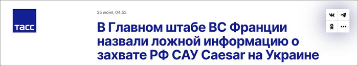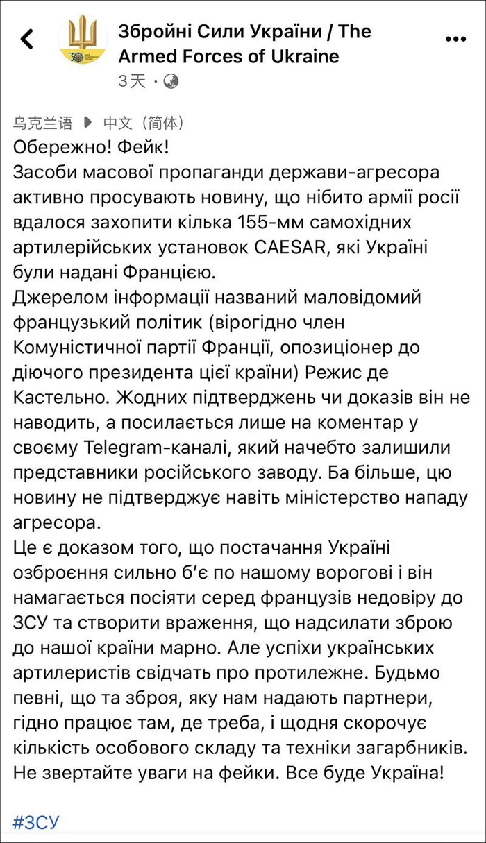6月25日,乌克兰武装部队否认两门凯撒大炮丢失的说法。乌克兰武装部队在Facebook上称,这一信息源自一名反对法国现任总统的政客,没有引用任何确认过的证据。声明说:“这证明向乌克兰供应武器对我们的敌人造成了沉重打击,对方试图在乌克兰武装部队和法国军队之间制造不信任,并制造向我们国家提供武器是无用的印象。”