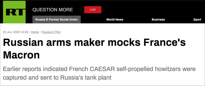 6月23日,生产多种俄军现役坦克及自行火炮的俄罗斯乌拉尔机车车辆厂在Telegram发文称,感谢马克龙的凯撒自行火炮。乌拉尔机车车辆厂在卡斯泰尔瑙的文章下留下评论称:“下午好,雷吉斯先生。我们请您转达我们对马克龙总统捐赠的卡车炮的感谢。当然,武器马马虎虎……跟我们的姆斯塔河-S型自行火炮没法比!但是尽管如此还可以用。请再送一些,我们照单全收。”