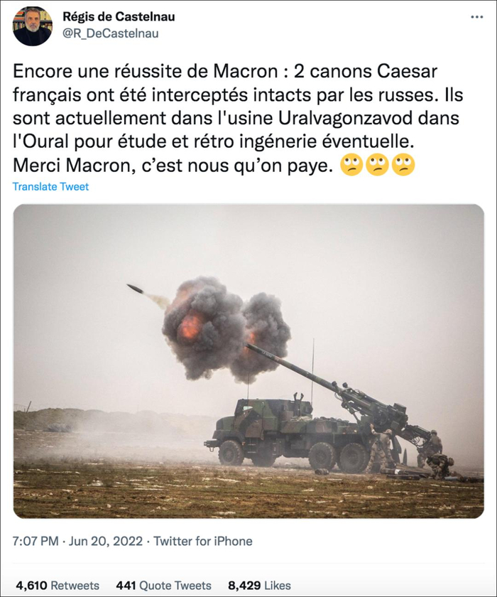 6月20日,法国律师、活动人士雷吉斯·卡斯泰尔瑙(Régis de Castelnau)在推特和Telegram平台发文批评法国总统马克龙:“马克龙的另一个成功:2门法国凯撒大炮被俄罗斯人完好无损地缴获。它们目前被送去乌拉尔机车车辆厂(Uralvagonzavod)进行研究和可能的逆向工程。谢谢你,马克龙,我们正在为此付出代价。”