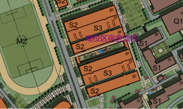 南校区宿舍项目用地位于南校区场地内,作为南校区学生新增住宿,项目建设内容包括:6栋学生宿舍,建筑面积约60000平方米,项目总投资预计约2亿元。