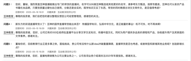 那么问题来了,6月15日豆神教育在互动平台回复投资者称“直播电商销售为公司主要业务之一”后,在20日又列举了销售额,以及对于2022年的收入比例等等,为何在6月21日一改说法?是什么原因导致了公司在相关陈述上的明显转变?《投资者网》联系豆神教育联系进行沟通,但未获回复。