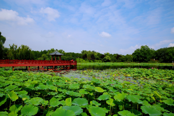 奥林匹克森林公园:赏花面积约250亩,主要分布在南园湿地和清河导流渠两块区域,其中湿地区域以红莲为主,还种植睡莲、芦苇、菖蒲等丰富的水生植物。公园湿地景区有叠水花台、沉水廊道等景点,小桥、栈道穿梭其间,是公园内最具吸引力的生态景观区域,更是游客赏荷花、摄影采风、写生画作、生态科普的聚集地。