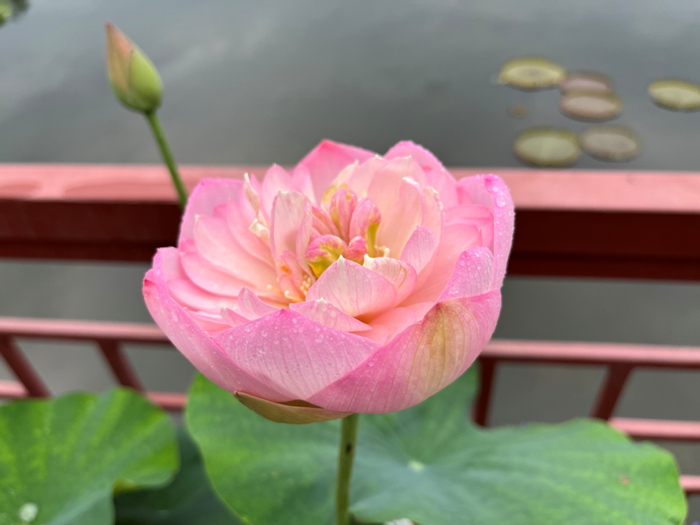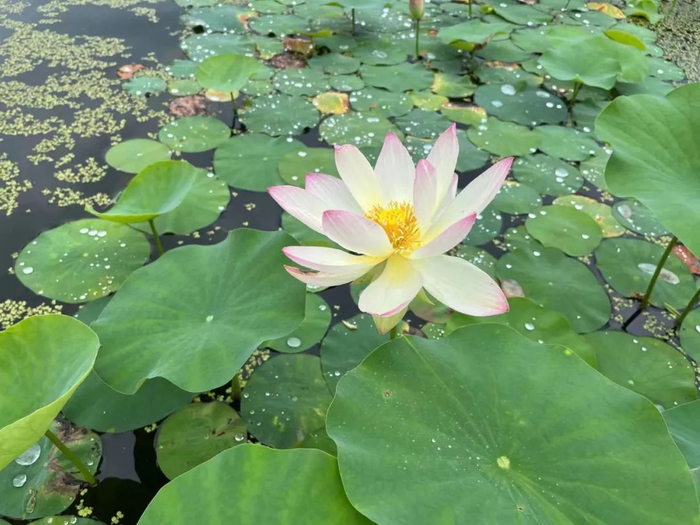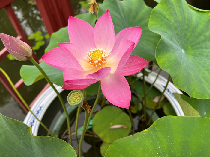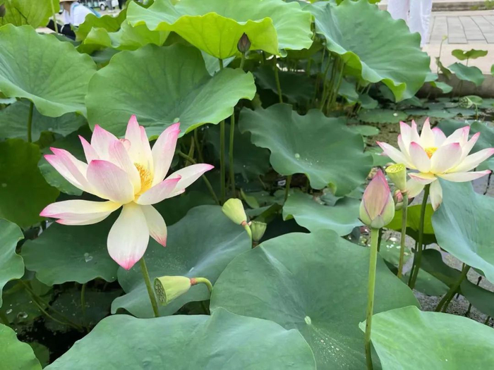 古莲池西面广场展示盆栽荷花品种约80个,包括‘娇容三变’‘伯里夫人’‘中日友谊莲’和‘舞妃莲’等中国传统荷花品种。