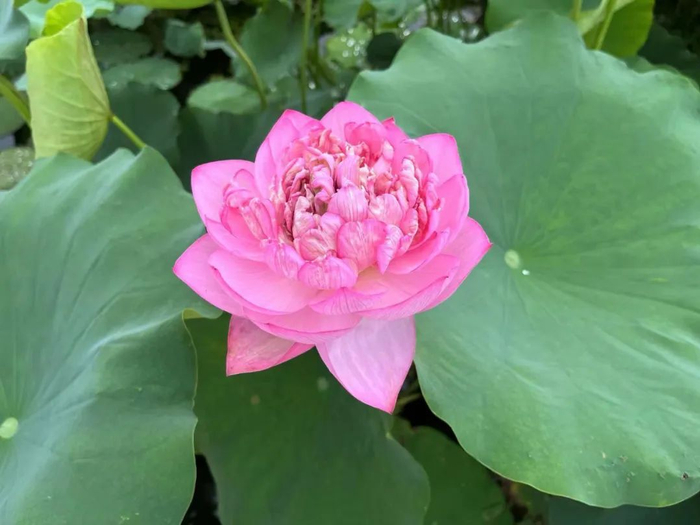 其中‘舞妃莲’花期较早,花色白中带粉,清新淡雅,花头略弯,似女子舞袖;‘白洋淀红莲’是数量最多、长势最强的品种,花朵粉红,遍布荷塘;‘大紫玉’是重瓣晚花品种,粉红色,数量较少,慢观细品可见其独特。