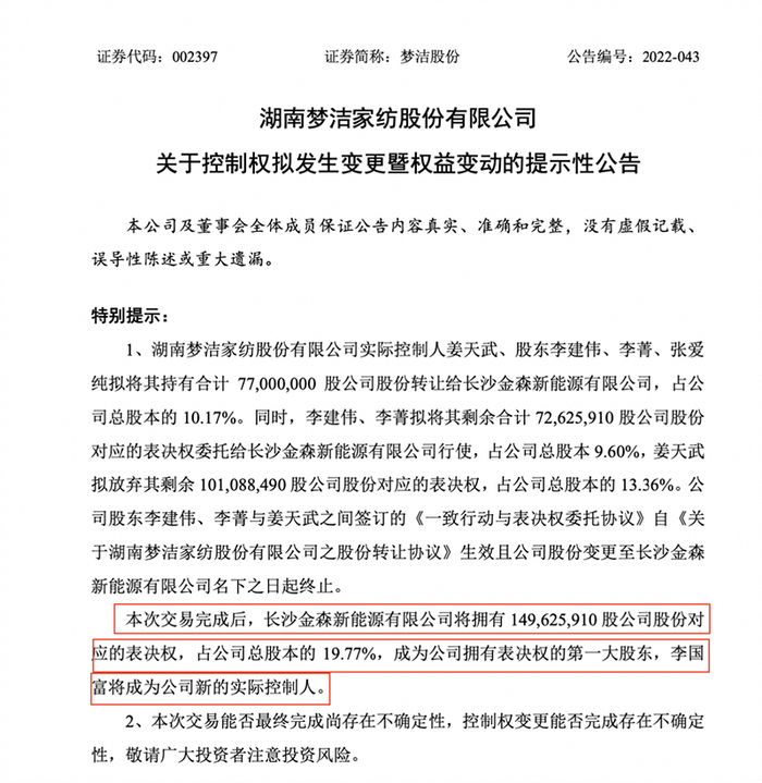 6月28日晚间,梦洁股份披露控制权拟发生变更暨权益变动的提示性公告。公司实控人姜天武、股东李建伟、李菁、张爱纯拟将其持有合计7700万股公司股份以每股5元(以28日收盘价为基准,溢价13.38%)转让给长沙金森新能源有限公司,占公司总股本的10.17%。同时,因大股东同时放弃表决权,交易完成后,长沙金森新能源有限公司将拥有19.77%公司股份对应的表决权,成为公司拥有表决权的第一大股东,李国富将成为公司新的实际控制人。