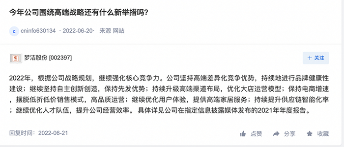 近日,公司在投资者互动平台也表示,“2022年,根据公司战略规划,继续强化核心竞争力。公司坚持高端差异化竞争优势,持续地进行品牌健康性建设;继续坚持自主创新创造,保持先发优势;持续升级高端渠道布局,优化大店运营模型;保持电商增速,摆脱低折低价销售模式,高品质运营;继续优化用户体验,提供高端家居服务;持续提升供应链智能化率;继续优化人才队伍,提升公司经营效率。”