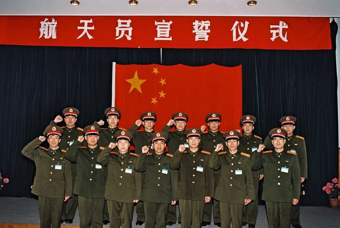 △中国航天员大队首批14名航天员(前排左起邓清明、聂海胜、杨利伟、吴杰、费俊龙、赵传东、翟志刚,后排左起刘旺、景海鹏、刘伯明、李庆龙、陈全、张晓光、潘占春)