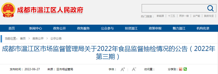 中国质量新闻网讯 近日,成都市温江区市场监督管理局发布关于2022年食品监督抽检情况的公告(2022年第三期)。