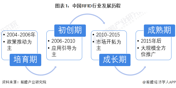 中国在政府、行业组织和企业的共同努力下,通过国家信息化重大工程(金卡工程)建设,引导众多行业开展了RFID应用试点、培育了市场。从时间上规划,中国的RFID产业发展大致需要经过四个阶段:2006年之前的培育期,2006-2010年初创期,2011-2015年高速成长阶段,2015年以后的成熟期。