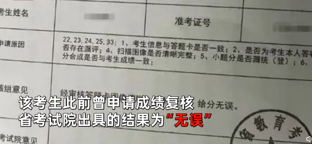 该考生此前曾申请成绩复核,省考试院出具的结果为“无误”,该考生仍表示不满,要求查验笔迹。