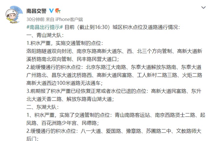 截至,南昌城区积水点位及道路通行情况: