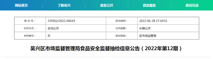 浙江省湖州市吴兴区市场监管局抽检351批次食品 不合格样品11批次