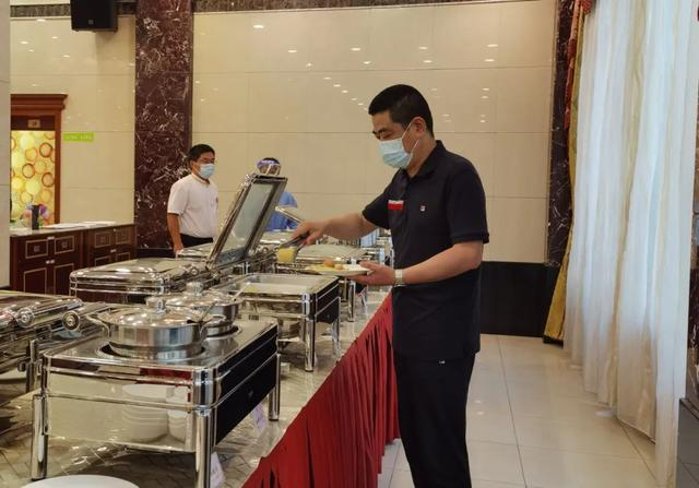 早上7点左右,烟火气开始升腾。在位于城桥镇新崇南路的锦绣宾馆大堂内,记者看到,八张餐桌整齐摆放。自助餐区域内,早餐品种丰富多样,包子、面条、油条、蛋饼应有尽有,让上班的顾客和旅客吃得称心、满意。大家自取完早点后,隔位就坐,享受着热腾腾的早饭。服务员身着统一“装备”,穿着蓝色防护服,戴着口罩、手套、面屏,服务着顾客。“上周来住的时候早饭还是送上门的,品种也比较单一,今天堂食就不一样了,我吃了馄饨、小米粥等,感觉很好。”一位旅客说。