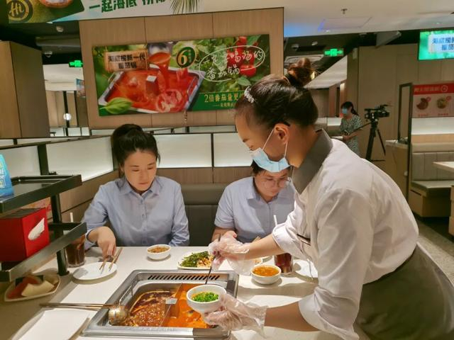 中午11点50分左右,万达广场三楼的几家餐饮店内,人气十足。在海底捞火锅店门口,陆续有顾客前来就餐。大家经过测温、扫码等流程后,有序进入店内,随后通过餐桌上的二维码进行非接触式点餐。店内、服务员忙碌不停,大家感叹,忙起来的感觉真好。