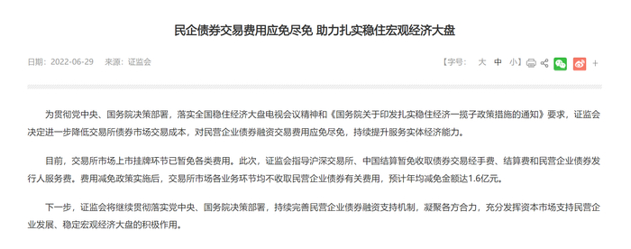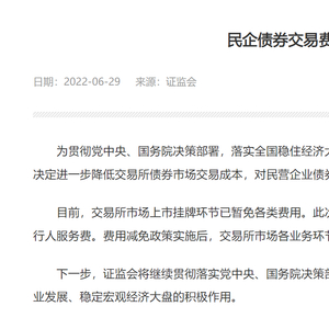 6月27日,证监会发文称,为贯彻党中央、国务院决策部署,落实全国稳住经济大盘电视会议精神和《国务院关于印发扎实稳住经济一揽子政策措施的通知》要求,证监会决定进一步降低交易所债券市场交易成本,对民营企业债券融资交易费用应免尽免,持续提升服务实体经济能力。