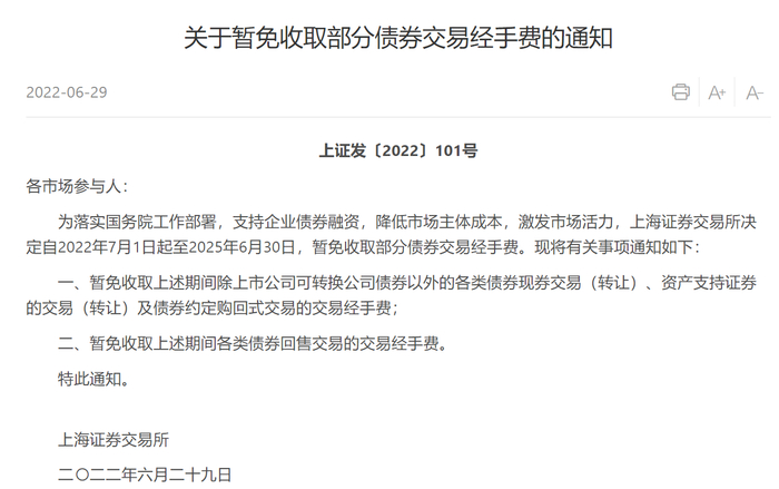 6月27日,上交所发布通知称,为落实国务院工作部署,支持企业债券融资,降低市场主体成本,激发市场活力,上海证券交易所决定自2022年7月1日起至2025年6月30日,暂免收取部分债券交易经手费。现将有关事项通知如下: