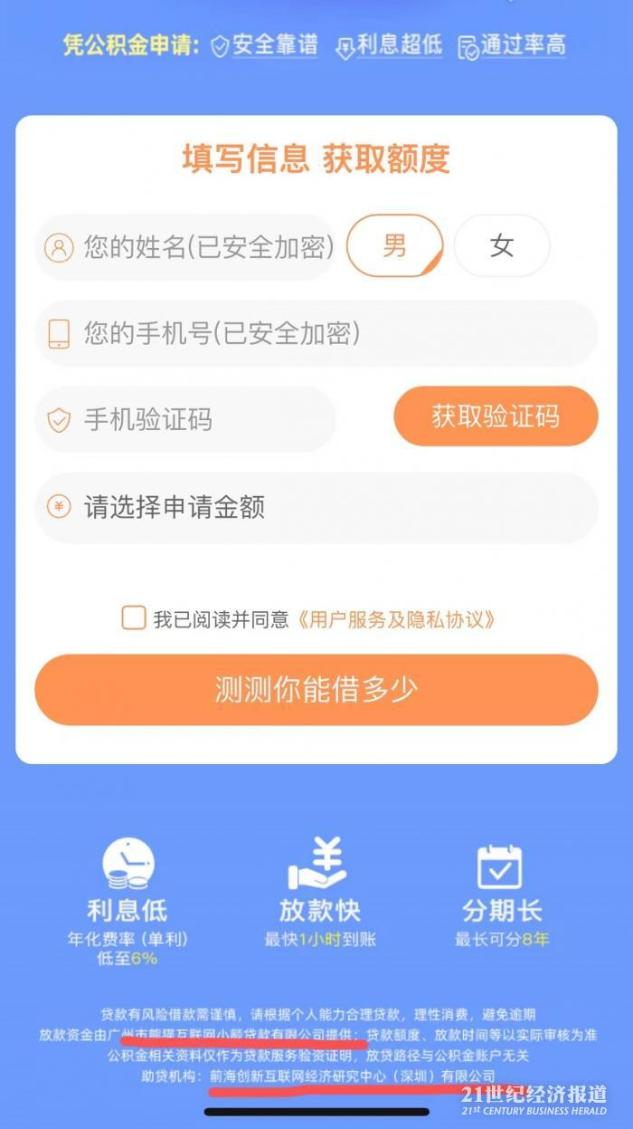 在申请借款页面的最下方,有一行极其不明显的小字,显示:“放贷资金由广州市熊猫互联网小额贷款有限公司提供,助贷机构为前海创新互联网经济研究中心(深圳)有限公司。”并且还暴露了放款人并非公积金中心的事实——小字还写着:“公积金相关资料仅作为贷款服务验资证明,放贷路径与公积金账户无关。”