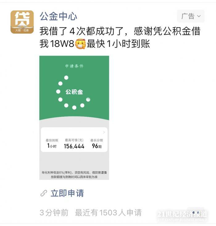 近期,21世纪经济报道记者在朋友圈看到一则“公金中心”发布的广告,再加上“我借了4次都成功了,感谢凭公积金借我18W8,最快1小时到账”以及“年化利率低至6%”的广告词,乍一看还以为是本地的公积金管理中心在放贷。