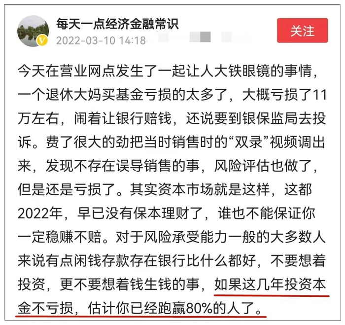最后一句话一针见血:如果这几年投资本金不亏损,估计你已经跑赢80%的人了。