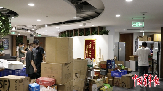 由于来洽谈合作的人太多,前台的会客区容纳不下,工作人员将沙发和茶几搬到电梯间,充当临时会客区。很多厂家的商务人员堵在楼下,还有冒充“东方甄选”选品团队的人在外面招摇撞骗。