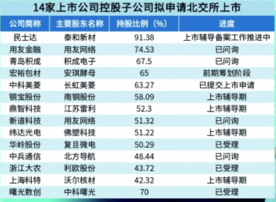 6月28日,泰和新材(002254)宣布,其控股子公司民士达拟申请北交所上市,泰和新材对该公司的持股比例为91.38%。就在3天前,安琪酵母(600298)刚宣布分拆宏裕包材,后者的上市地也是北交所。据记者不完全统计,目前已有14家上市公司正在推进分拆子公司赴北交所上市事项。