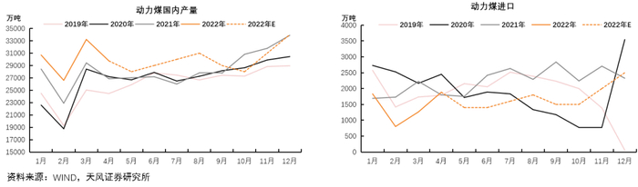 国内生产有增量:动力煤下游需求以发电为主,因此是保供主力,随着晋陕蒙动力煤矿产能的不断核增,国内产量仍然居高不下,我们预计2022年动力煤产量同比去年增加2亿吨。