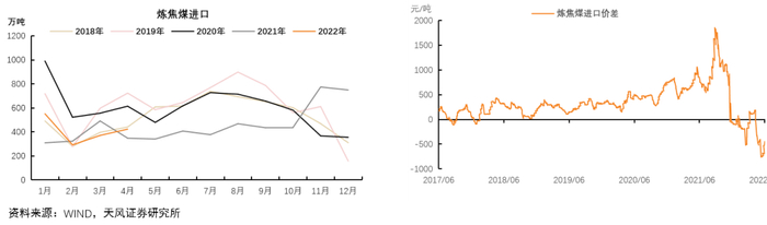 低库存的格局难以转变:由于我国主焦煤对外依存度较高,国际煤炭贸易的不稳定导致进口减量,从而加剧炼焦煤供需失衡,疫情期间都难以大幅累积的库存,后期赶工状况下更可能再创新低。