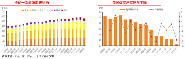 去煤化已导致全球主要产煤国产能下降:全球主要产煤国针对煤矿建设的资本开支不断减少,以全球第一大煤炭储量国美国来说,煤炭产能从2010年的最高14.64亿吨下滑到2020年的10.28亿吨,削减度达30%。煤矿建设由于涉及环保等敏感问题,新进资本开支审批非常困难,而较长的煤矿建设周期也使得利润向供应端的传导难以流畅。