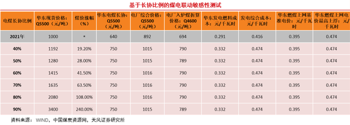 燃煤电价的改革已打开一定的政策空间:基于2021年燃煤电价改革后的情况,选取全国煤炭及电力市场核心区域华东区作为样本,对不同长协比例下的煤电联动进行敏感性测试,当电煤长协兑现率达到70%-80%之间,则可实现火电盈利与煤炭价格突破政策瓶颈的双赢。而电煤长协比例在70%-80%之间时,动力煤市场化比例介于49%-56%之间,此时仍可实现煤炭企业利润的高增长。