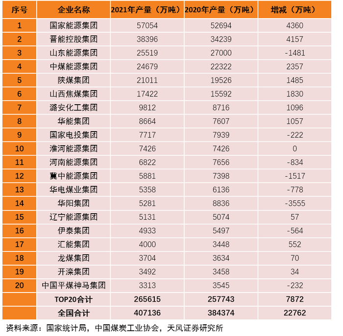 民营中小型煤矿作为保供主力军的数据依据:2021年TOP20龙头煤企,煤炭生产总量26.56亿吨,占全国煤炭总产量65%,同比2020年增加0.79亿吨;但同期全国煤炭总产量却比2020年增加了2.28亿吨,意味着非龙头中小型企业贡献了1.49亿吨的增量,是TOP20的1.89倍。