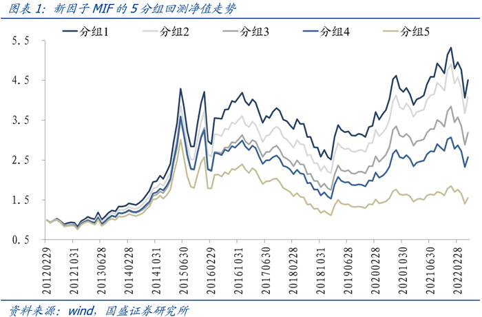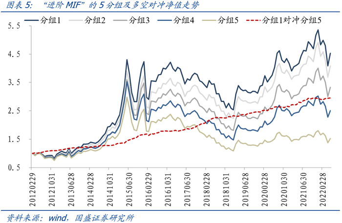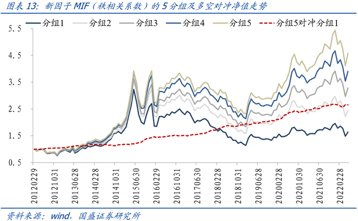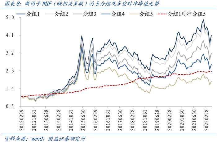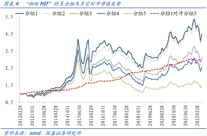 图表4展示了“初始MIF”的5分组及多空对冲净值走势。在全体A股中,回测期2012/01/01-2022/05/31内,“初始MIF”的5分组多空对冲年化收益为11.20%,年化波动为5.41%,信息比率为2.07,月度胜率为69.92%,最大回撤为3.03%,整体效果已经不错。