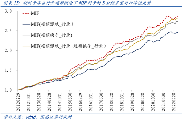 现在修改上述方案,先计算每只股票相对于各自中信一级行业的超额涨跌、超额换手,将得到的新因子分别命名为MIF(超额涨跌_行业)、MIF(超额换手_行业)、MIF(超额涨跌_行业+超额换手_行业):