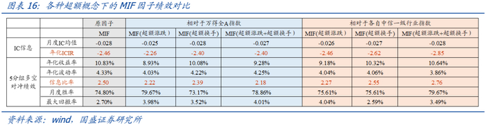 图表15展示了各个新因子的5分组多空对冲净值走势;图表16则汇报了各个因子的IC信息及多空对冲绩效指标,并与原来的MIF因子、相对于市场整体指数的几个超额因子进行了对比。可以看到,各个新因子的净值曲线虽略有差异,但趋势十分相近;5分组多空对冲的绩效指标也相差不大,信息比率都维持在2以上。特别地,MIF(超额涨跌_行业+超额换手_行业)的选股效果最强,5分组多空对冲的信息比率可达2.76,月度胜率接近80%。