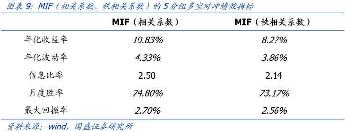 图表8展示了新因子MIF(秩相关系数)在全市场5分组及多空对冲的净值走势,图表9则比较了其与原因子(相关系数)的各项绩效指标。可以看到,改为秩相关系数后,MIF的信息比率略有下降,但仍可达到2.14,整体来看仍然具备有效的选股能力。