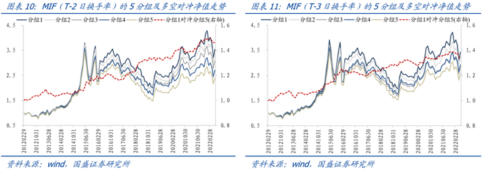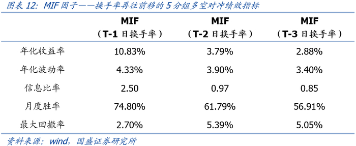 可以发现,将换手率再往前移,MIF的选股效果显著下降,比如MIF(T-2日换手率)的信息比率只有0.97,月度胜率下降至61.79%。该现象其实也进一步验证了MIF因子的逻辑:离信息真实发生的时点越近,越容易提前得到信息;既然是想要判断影响股票T日开盘涨跌的信息,是否被知情交易者提前获取,那么自然是观测T-1日的换手率更为有效。